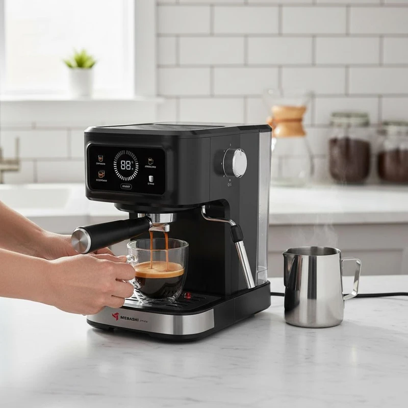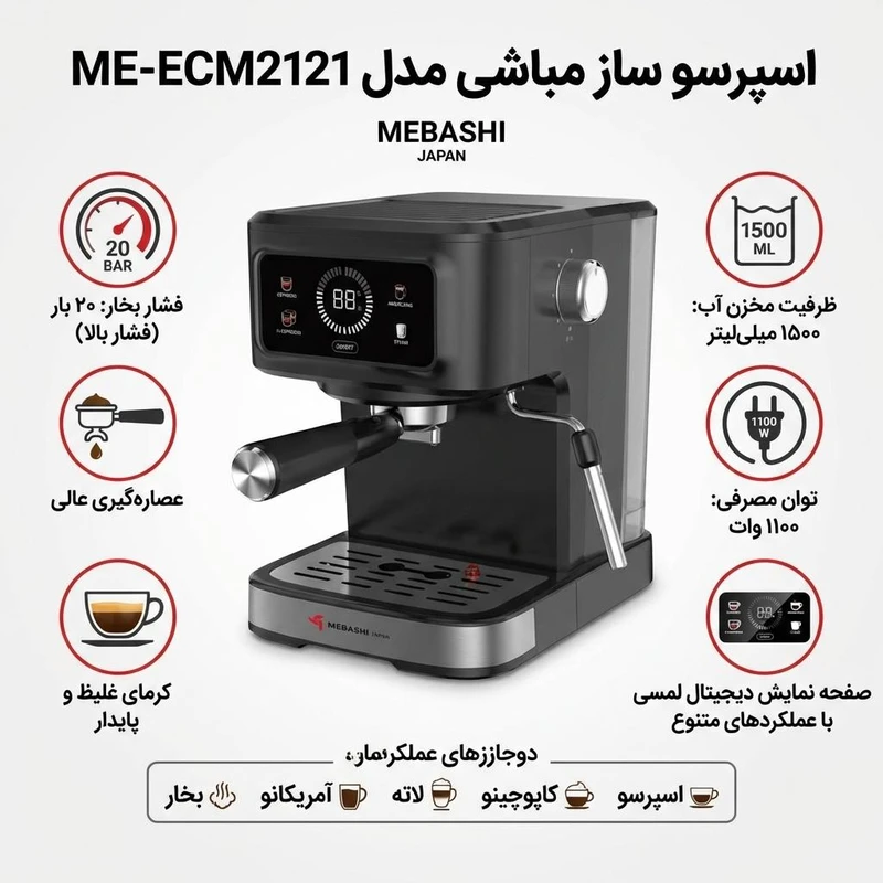 اسپرسوساز مباشی مدل ME-ECM 2121 دستگاهی قدرتمند و کاربرپسنده که برای علاقهمندان به قهوه طراحی شده. با پمپ 20 بار Ulka ایتالیایی برای استخراج کامل، سیستم Thermo Block برای گرمایش سریع و مخزن آب 1.5 لیتری جداشدنی شفاف، این اسپرسوساز خانگی قهوهای با کرمای غلیظ و طعم اصیل تولید میکنه. توان 1500 وات، بدنه ABS مشکی با کیفیت بالا، تابه لمسی خودکار برای فنجان تک و دبل، سینی چکه جداشدنی و محافظت از گرمای بیش از حد و فشار، اسپرسوساز مباشی مدل ME-ECM 2121 رو برای استفاده روزانه ایمن و آسان کرده. در ادامه، ویژگیهای اسپرسوساز مباشی مدل ME-ECM 2121 رو بررسی میکنیم.